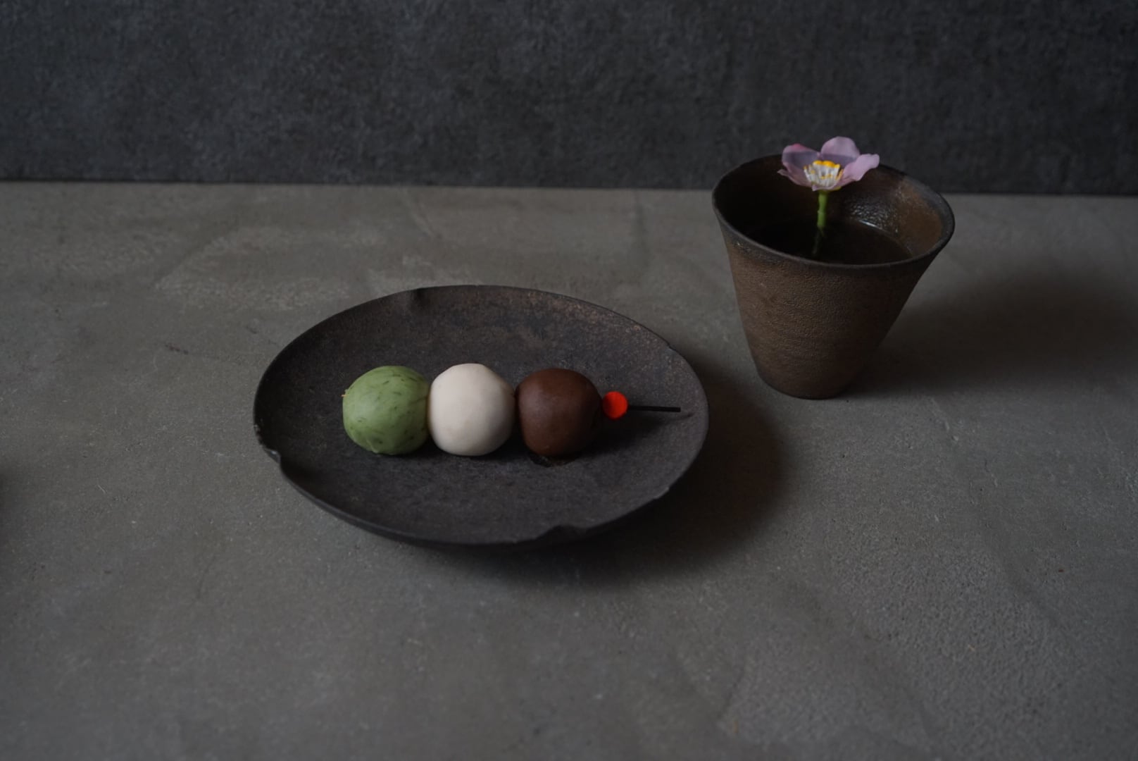花より団子、と召し上がって仰ってもらえるように、3種の団子をかんざし串に刺してお作りします。